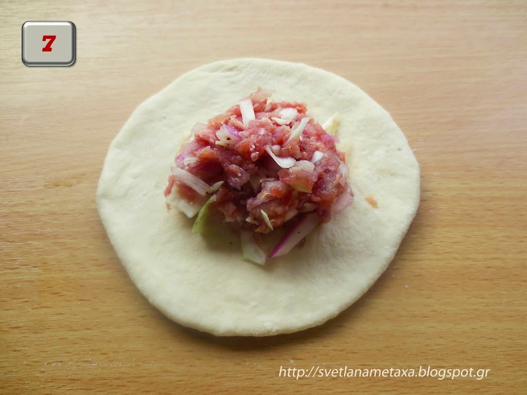 Начинаем лепить пигоди. На самом деле это гораздо проще, чем лепить манты. Для этого тесто раскатываем и делим на 20 частей. Из каждой части раскатываем круглую лепешку. В середину выкладываем начинку